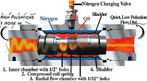 Another method of using compliant nitrogen to deal with noise-causing pulsations is to mount an in-line nitrogencharged noise suppressor right at the outlet of the pump. (This suppressor is described in detail in the box at right.) This design is more efficient than a large conventional accumulator because the fluid flow-path to the bladder is short and unrestricted, and the fluid contacts a much greater bladder area,