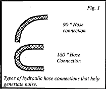 It is this ripple or pulsation that produces line vibrations which cause additional noise. Until recently most pump manufacturers ignored the transmission of these pulsations because the methods of trying to eliminate them were too expensive and the transmission and radiation of the pulsations was considered to be the circuit designer's responsibility. This paper deals with new inexpensive methods of reducing the transmission of these pulsations and thus reducing the entire circuit noise level.One of the first things that should be reviewed when attempting to reduce power unitFigure 1 noise is the hydraulic lines. The one source that contributes the most to adding noise is the incorrect use of hydraulic hose. Recent research at a large pump manufacturer showed that they were able to take an average of 5 dB(A) out of a standard power unit merely by changing the configuration of the hydraulic hose (see fig. 1). In the past, a 90 degree curved hose was used when a horizontal line had to be connected to a vertical line. A 180 degree curved hose was also quite common.