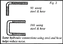 Research has shown that both of these configurations actually increase the noise level in the system. The solution is to not bend hydraulic hose but to use a metal tubing for any bend and only use hose in a straight line (see fig. 2). |