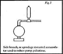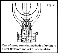 | Through the years the nitrogen charged hydraulicFigure 3 accumulator has been used in most circuits to absorb hydraulic pulsations. At first the accumulator was used as an appendage device. It hung on the hydraulic line and the designer hoped that the pulsations would enter the accumulator (see Fig. 3). However practice showed that the majority of the pulsations bypassed the line leading to the accumulator. Then various different designs evolved in which the full flow was diverted into the accumulator (see Fig. 4). Sizing this type of accumulator is complicated and the design that diverts the flow into the accumulator is very expensive. The pressure drop through these accumulators is also very high and can create a problem. |