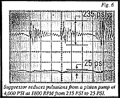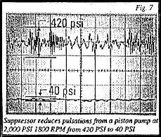 However more important than ease of sizing is how well the unit suppresses the pump pulsations and why it works better than other types of accumulators. It is more effective than a much larger accumulator because the fluid only flows .25" radially before it comes in contact with the bladder. Often when using an accumulator the flow path is at least four or five inches long before the fluid contacts the bladder. This short flow path coupled with the fact that there is a much greater flow area leading to the bladder makes the suppressor much more efficient. To date the largest piston pump manufacturers have used the suppressor to help them meet or exceed the strictest automotive noise standards. Figures 6, 7, and 8 show the results of the suppressor tested at pressures from 750 PSI. to 4000 PSI. and at both 1200 RPM and 1800 RPM.